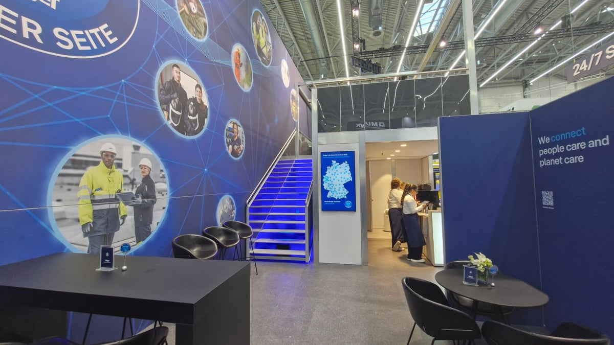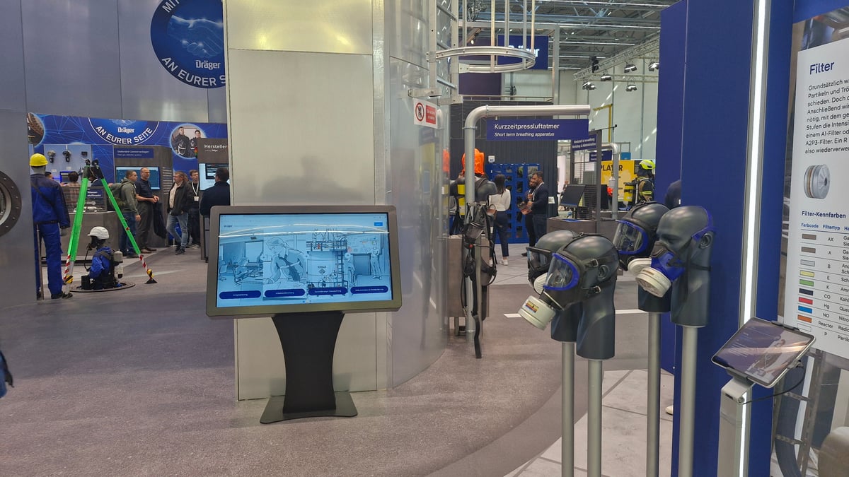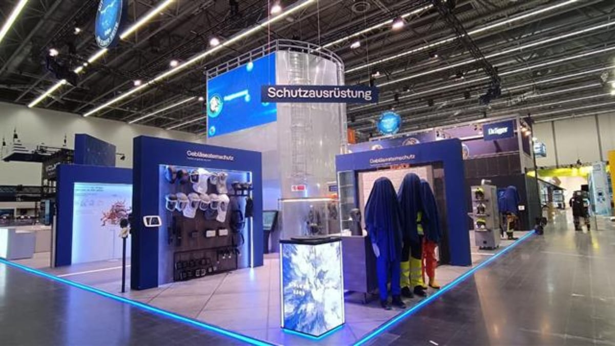 Der Messestand von Dräger überzeugte durch eine Vielzahl an gestalterischen und interaktiven Elementen, die das dargestellte Industrieszenario visuell und funktional unterstützen: