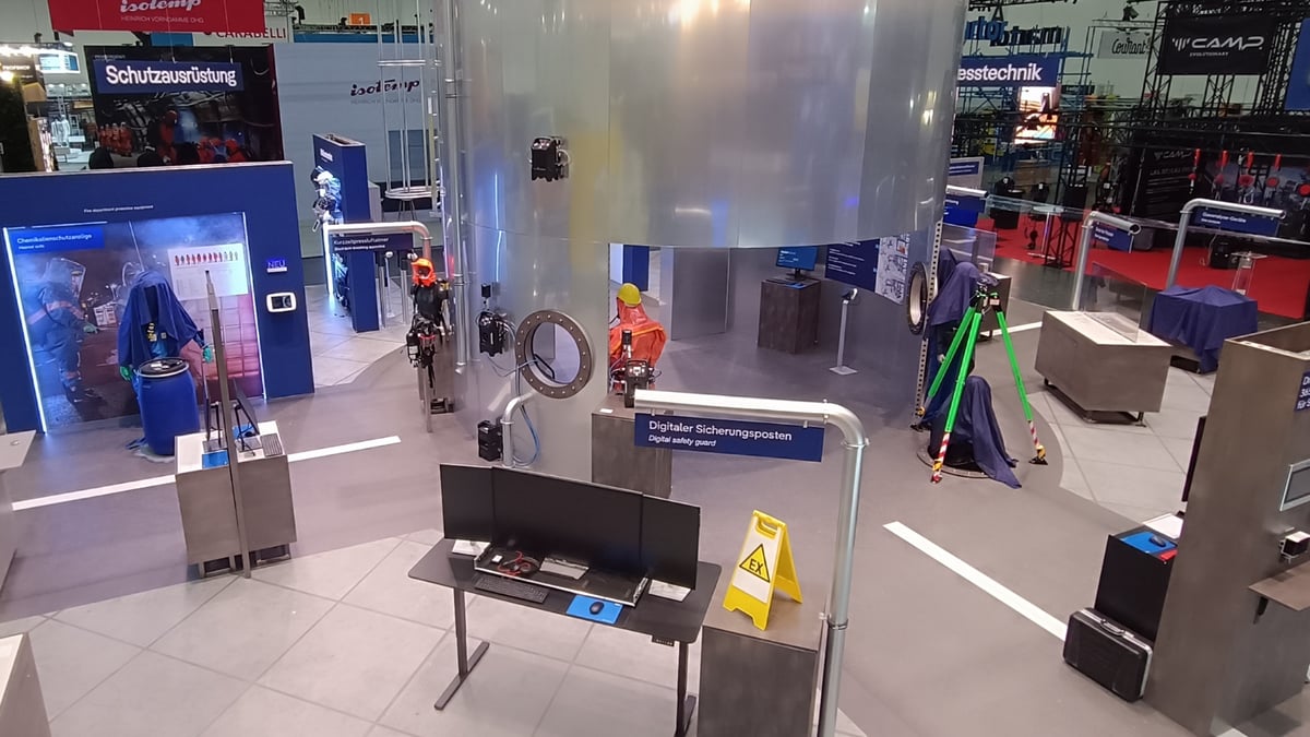 Im Zentrum des Messestands wurde ein Industrieszenario in Anlehnung an eine Tankanlage inszeniert, das den thematischen Rahmen für die dargestellten Anwendungen bildet. Als weithin sichtbarer Eyecatcher fungiert ein lebensgroßer Nachbau eines Industriesilos, der das zentrale Element der Szenografie darstellt.