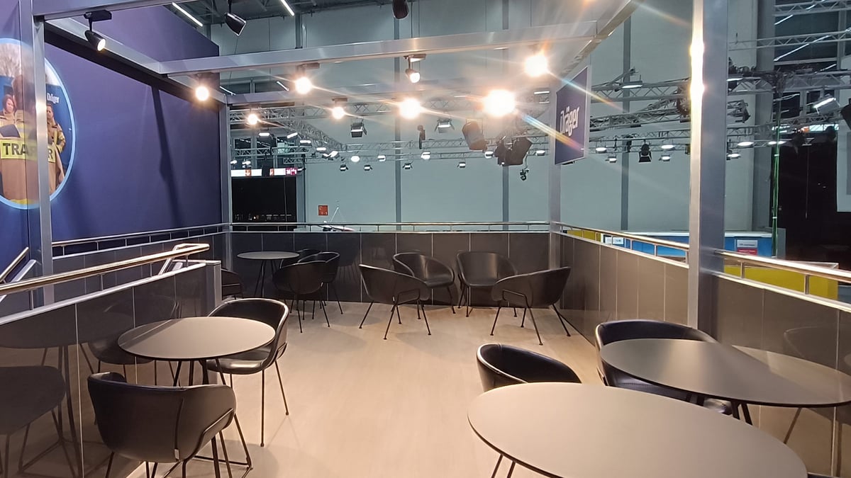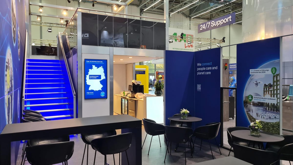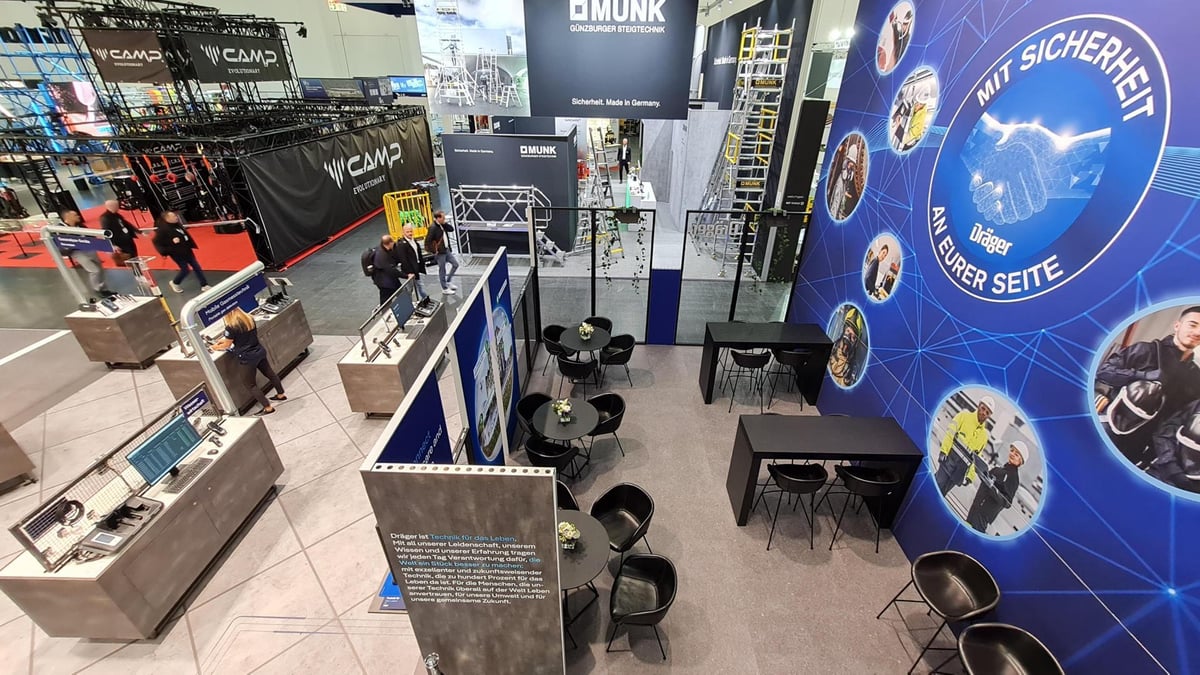 Für die A+A Düsseldorf, eine der weltweit führenden Fachmessen für Arbeitsschutz und Sicherheit, realisierte Dräger gemeinsam mit uns einen markanten Doppelstock-Messestand.