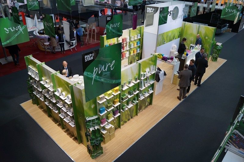 Besonders die Produktpräsentation der Serie PAPSTAR pure - die nachhaltigen Einwegartikel - passte gut in das Konzept des Messestands aus umweltfreundlichen und wiederverwertbaren Materialien. Die Botschaft lautete klar: Produkte aus nachwachsenden Rohstoffen sind eine lohnenswerte Alternative zu klassischen Einwegartikeln.